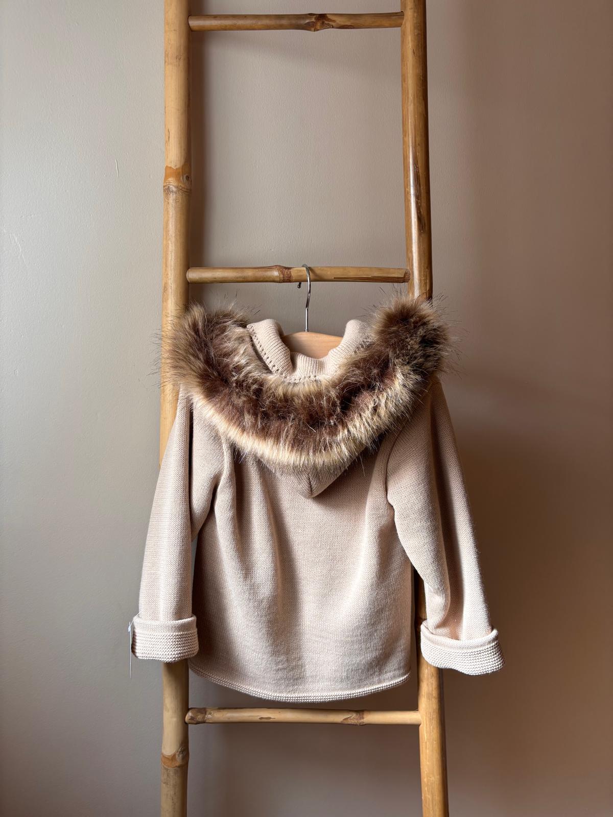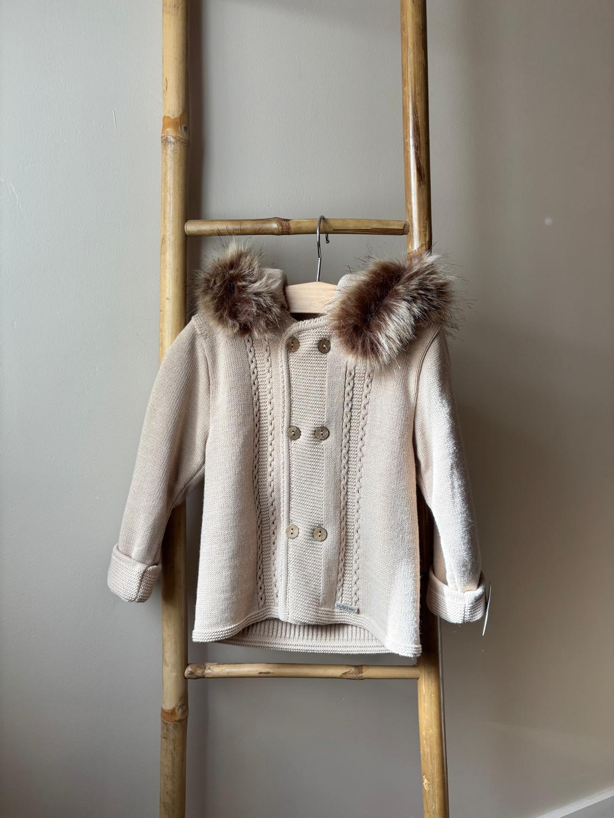 Esta elegante chaqueta o abrigo infantil de punto en color beige es una prenda ideal para proteger del frío con estilo. Confeccionada en un tejido cálido y confortable, está pensada para mantener a los más pequeños abrigados durante los días de clima frío.