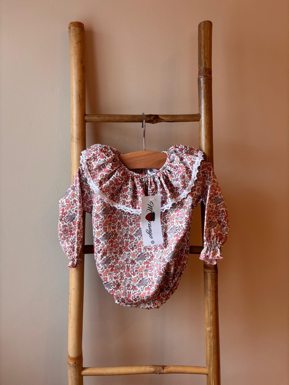 Body infantil confeccionado en tejido suave, ideal para la piel delicada del bebé. Presenta estampado floral en tonos rosas, azules y naranjas sobre fondo claro, con cuello amplio con volantes y encaje blanco. Incluye mangas largas con puños fruncidos, cierre trasero con botones y parte inferior tipo body, perfecta para un cambio de pañal cómodo y rápido.