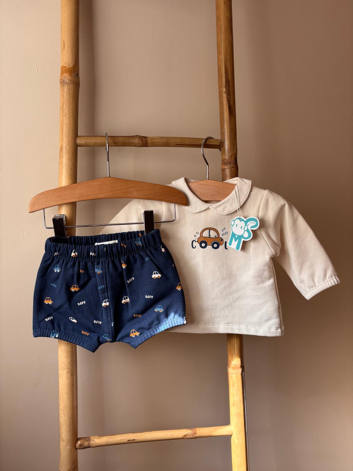 Conjunto infantil casual compuesto por camiseta crema de manga larga con estampado de coche y texto “COOL”, y pantalón corto azul marino con estampado de coches.