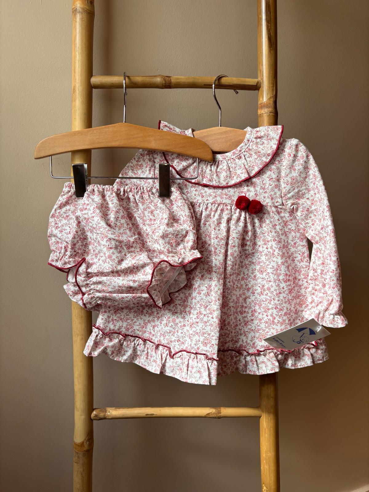 Vestido infantil de manga larga con estampado floral en tonos rosados y detalles en rojo, pensado para combinar estilo y comodidad. Presenta cuello redondeado con volante, ribetes rojos y un delicado adorno de dos pompones en el pecho, mientras que el volante en el bajo aporta movimiento y encanto al conjunto. Incluye braguita a juego con el mismo estampado y ribete rojo, completando un look adorable. Ideal tanto para ocasiones especiales como para el día a día en climas frescos, transmitiendo ternura y estilo clásico en cada detalle.