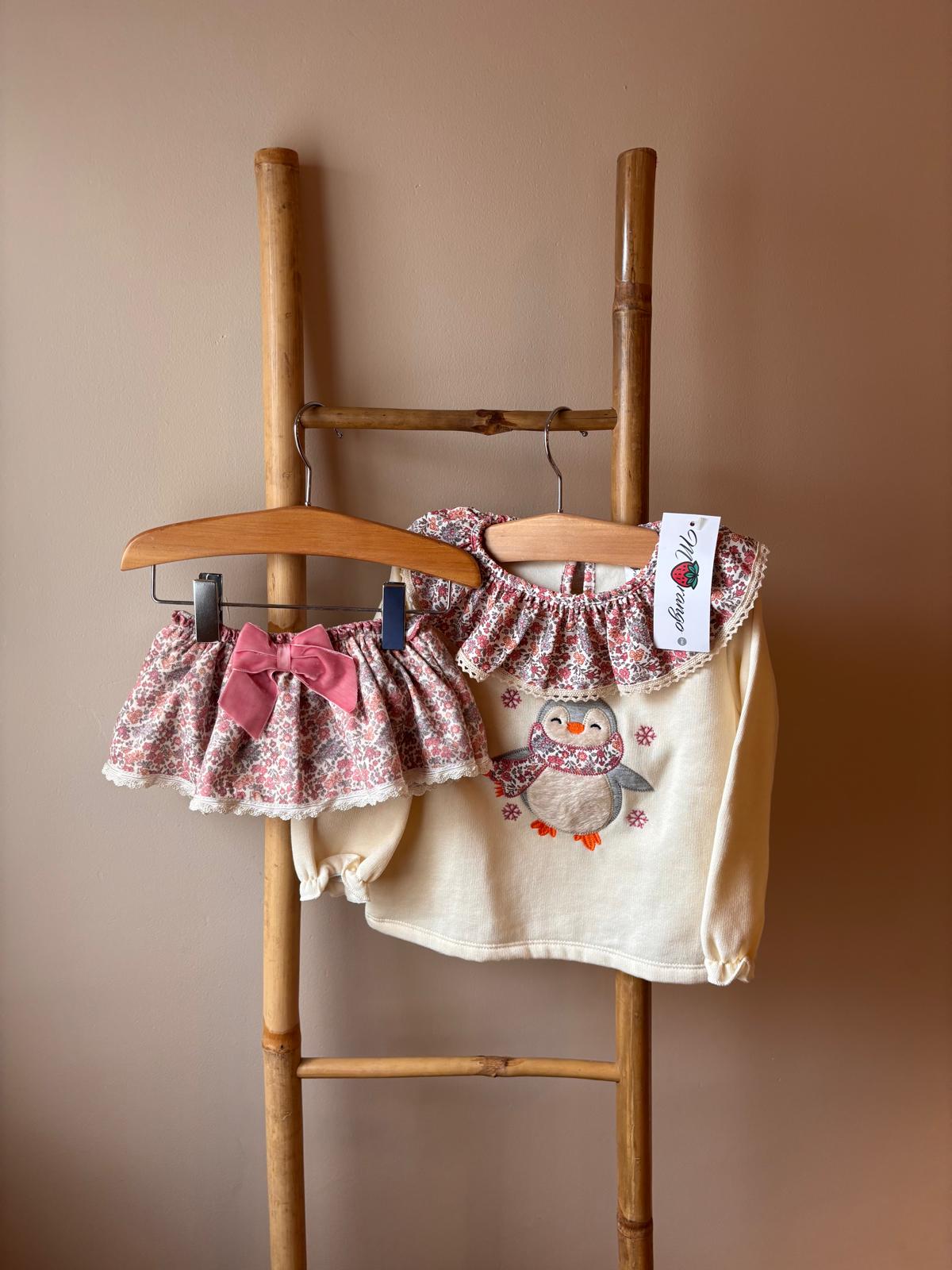 Conjunto infantil especialmente diseñado para bebés y niñas pequeñas, ideal para la temporada de otoño e invierno. Está compuesto por una camiseta de manga larga en color crema, con un elegante volante amplio en el cuello confeccionado en tela estampada con flores en tonos rosa y marrón, que aporta un estilo delicado y clásico.