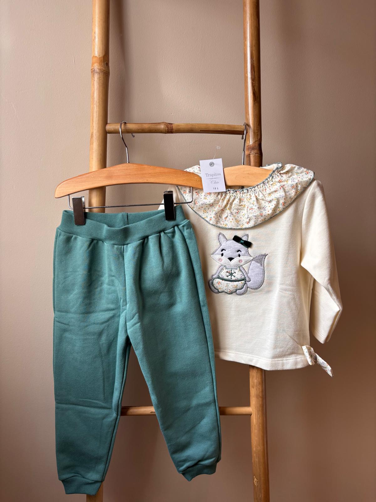 La parte inferior se completa con un pantalón largo de punto en color verde, con cintura elástica para un ajuste cómodo y puños en los tobillos, que garantizan mayor sujeción y libertad de movimiento. Confeccionado en un tejido suave y agradable al tacto, este conjunto es perfecto tanto para el día a día como para ocasiones especiales, combinando funcionalidad, confort y un estilo dulce y natural.