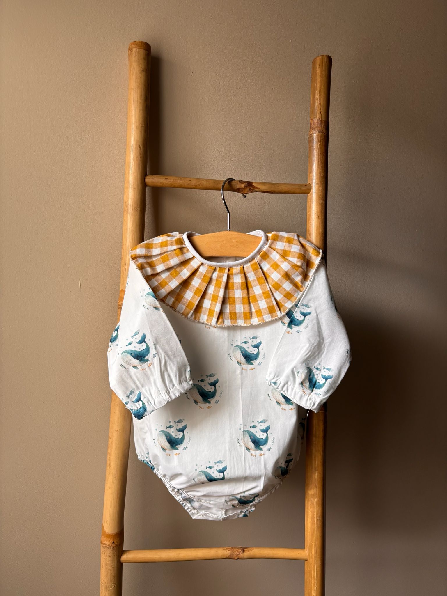 Pelele bebé estampado ballenas con cuello vichy