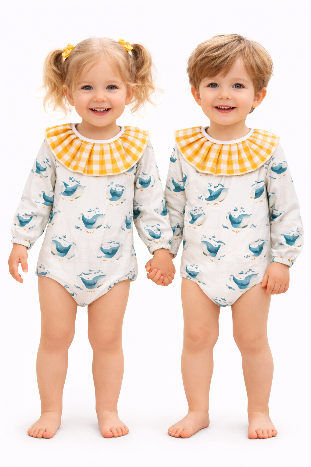 Pelele infantil con encantador estampado de ballenas y cuello volante vichy. Confeccionado en tejido suave y transpirable, garantiza comodidad y libertad de movimiento para el bebé. Ideal para el día a día o para ocasiones especiales con un estilo dulce y elegante.