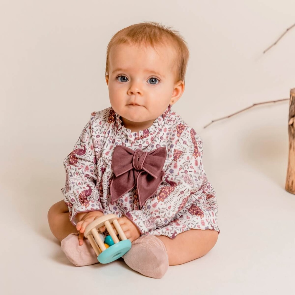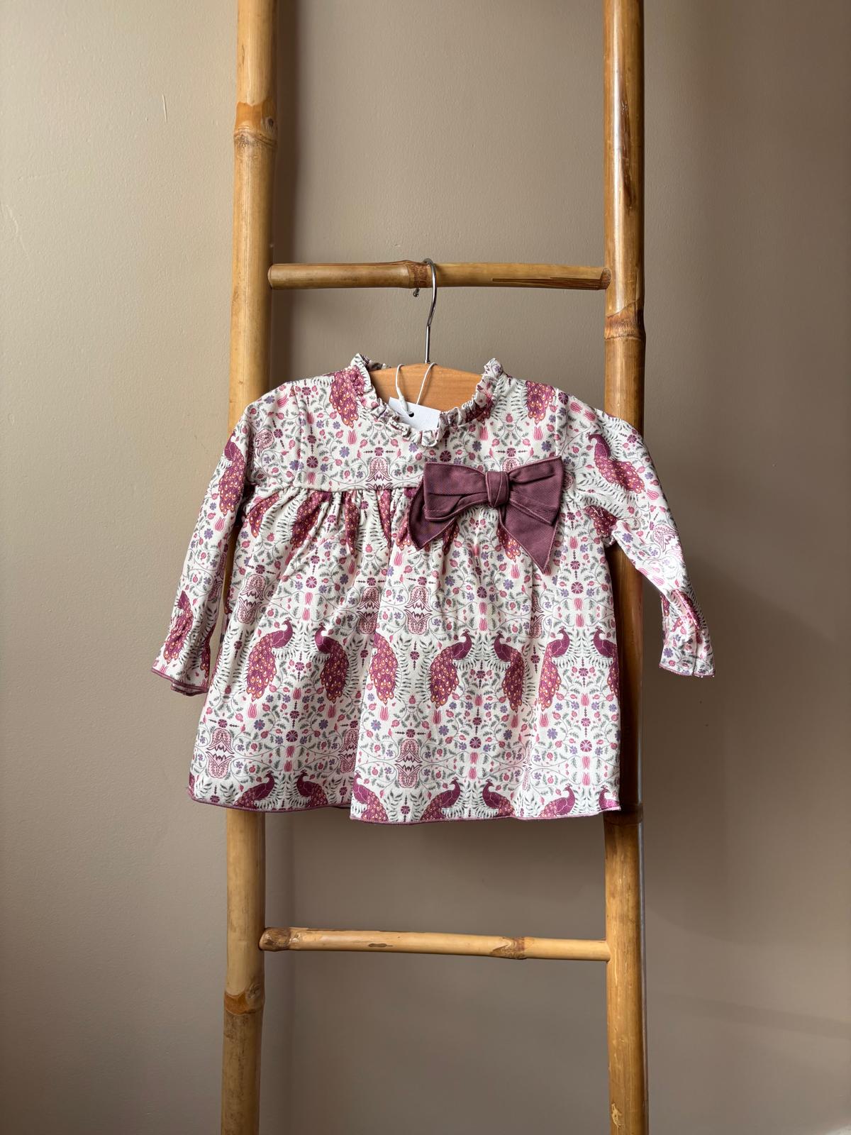 Este delicado vestido de manga larga para niña está confeccionado en una suave tela con un encantador estampado floral y de aves, combinando tonos rosados, lilas y blancos que aportan dulzura y elegancia al conjunto.